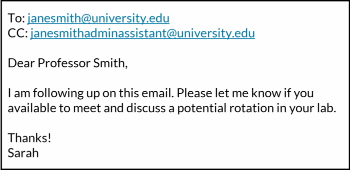 This updated email structures the email to be purpose-first, so Professor Smith immediately knows that we are interested in meeting to discuss a rotation. Additional context is provided below, but is optional depending on your email style. Intentional formatting, such as line breaks and bolding, increase readability and emphasize our request to schedule a meeting.