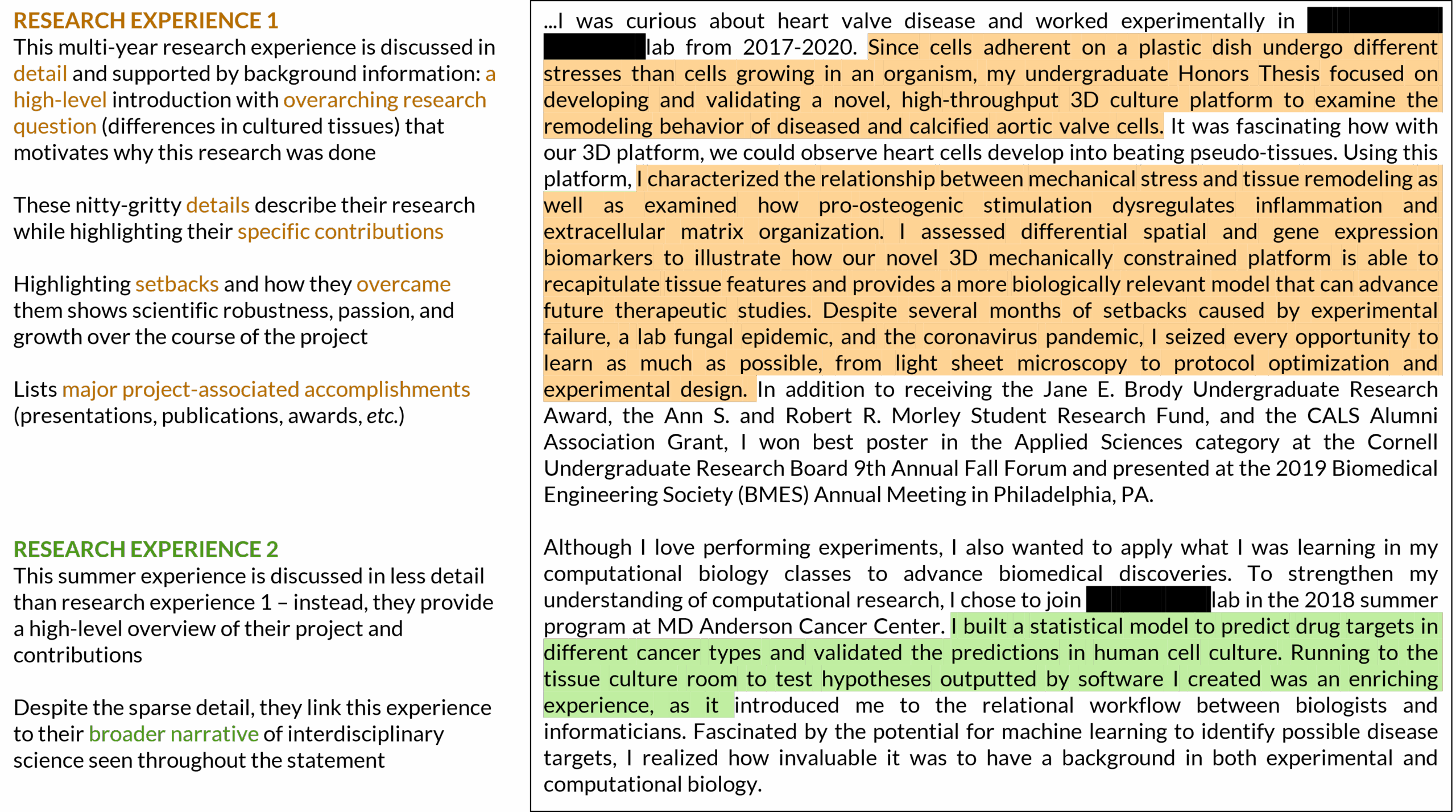 - Example: “Alongside my research experiences in biological instrumentation and cell biology, I rounded out my skill set by gaining further experience in computational biology through a project with Dr. ██████, a clinical investigator at █████████████” from Annotated Example 4