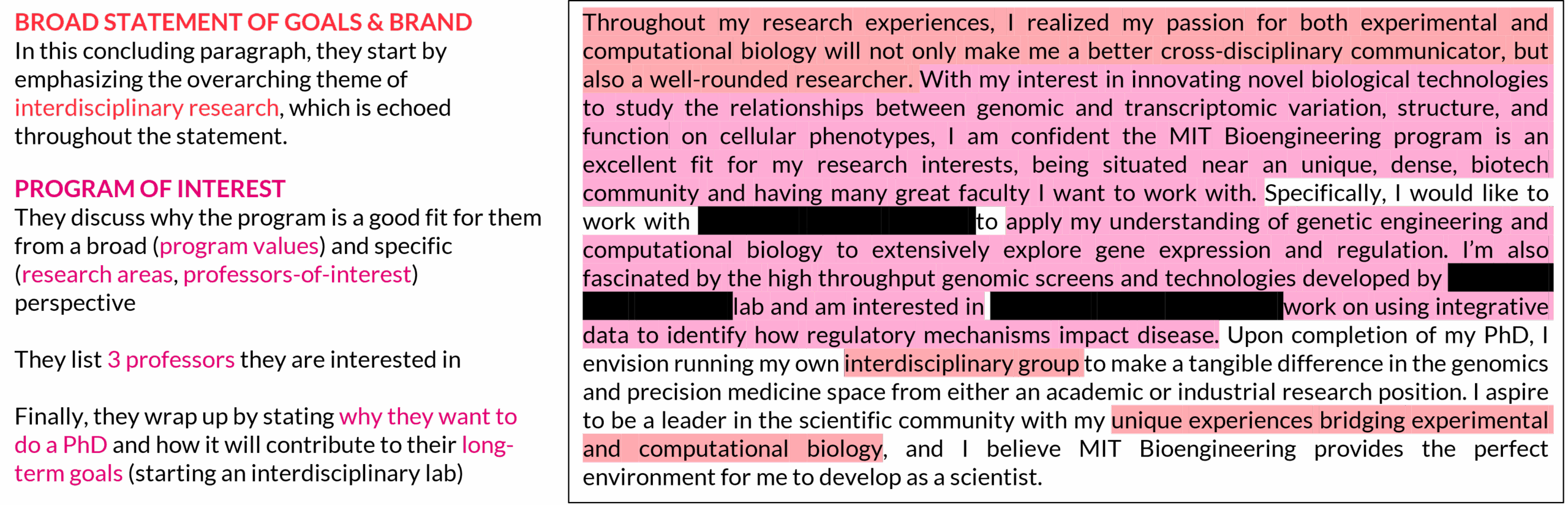- Example: “However, I quickly realized that I was more interested in intersecting bioengineering, genomics, and computational biology to explore molecular mechanisms.” from Annotated Example 3